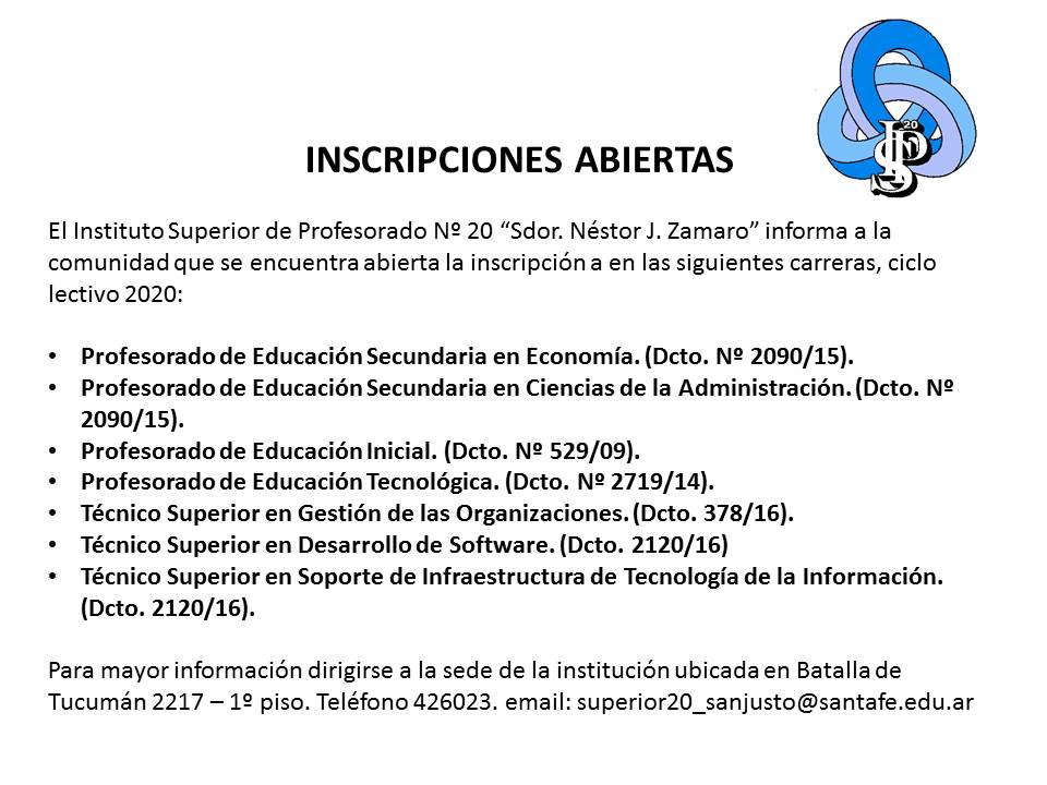 Inscripciones abiertas al Ciclo Lectivo 2020 del I.S.P. N° 20 “Senador Néstor Juan Zamaro” – ver imagen de portada. Para mayor información dirigirse a la sede de la institución, ubicada en Batalla de Tucumán 2217 – 1er. piso – Teléfono 03498-426023 o al mail superior20_sanjusto@santafe.edu.ar.