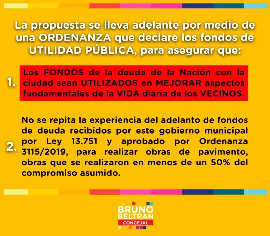 No queremos que se repita la experiencia del adelanto de fondos de deuda recibidos por este gobierno municipal por Ley 13.751 y aprobado por Ordenanza 3115/2019, fondos que se habían entregado para realizar obras de pavimento en diferentes sectores de la ciudad, obras que se ejecutaron en menos del 50% del proyecto aprobado, desconociendo al día de hoy donde fueron a parar el resto de los recursos.