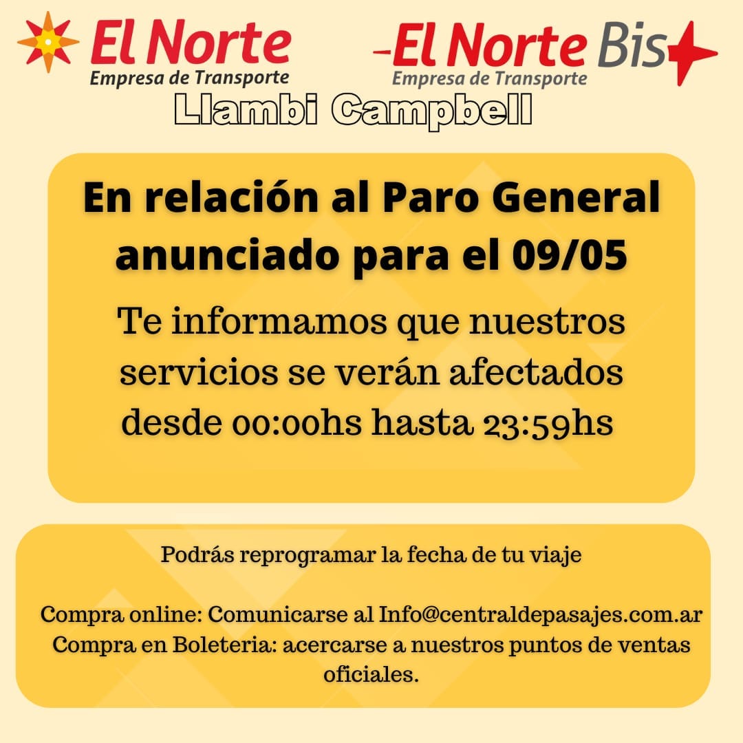 La empresa de transporte de pasajeros El Norte comunica que el día 9 de mayo, los servicios estarán parados desde las 0 horas y hasta las 23.59 del mismo día por el paro general dispuesto por la CGT.
