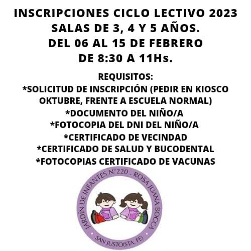 La dirección del Jardín de Infantes n° 220 “Rosa Juana Bocca” comunica que a partir del lunes 6 de febrero comienzan las inscripciones al Ciclo Lectivo del presente año, para las salas de 3, 4 y 5 años. El horario será de 8,30 a 11 horas, dicho período se extenderá hasta el día 15 de este mes.