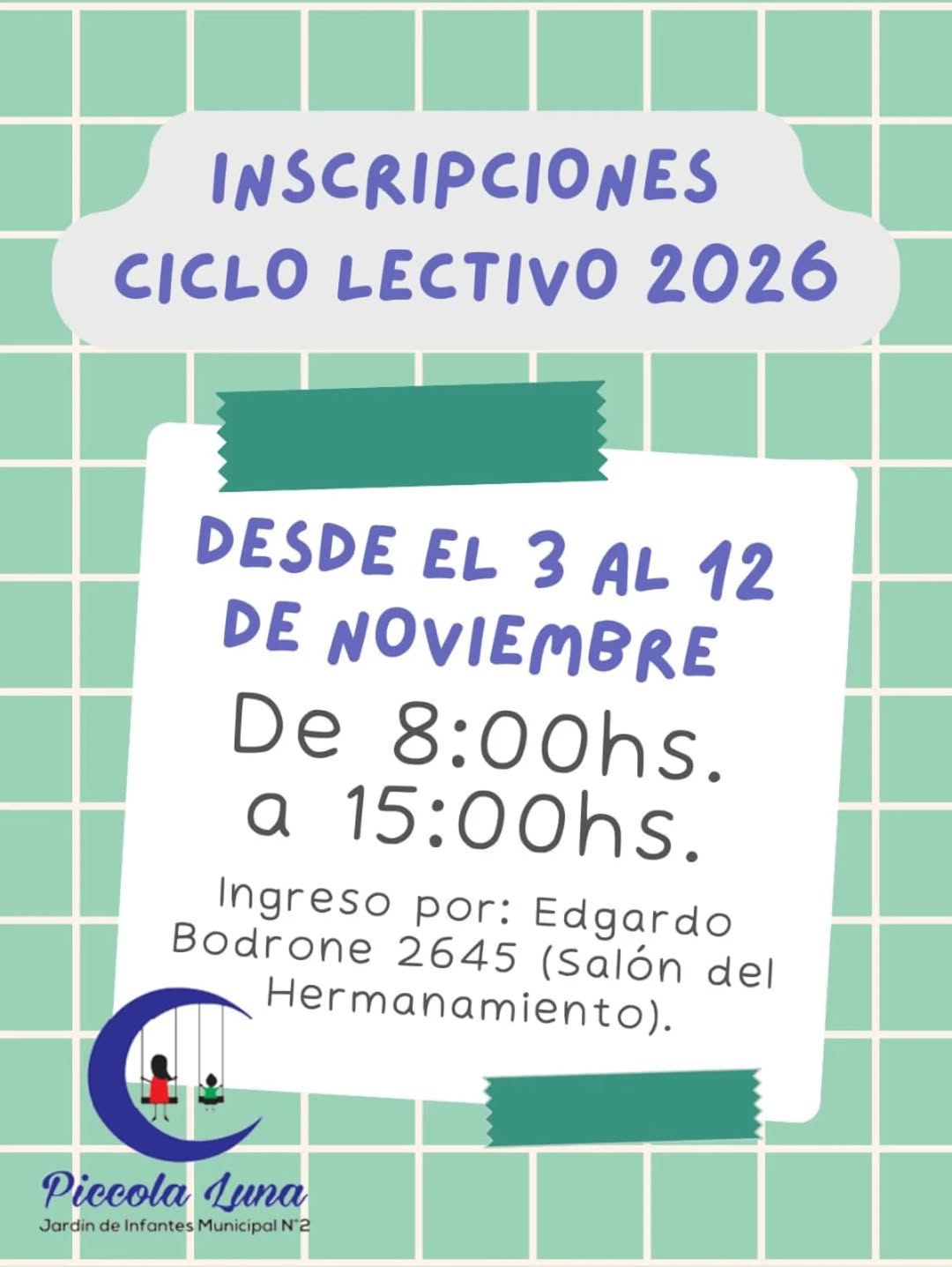Fechas de inscripción para el Ciclo Lectivo 2026. Desde el 3 al 12 de noviembre, de 8 a 15 horas. Los interesados deben acercarse con fotocopia del DNI del niño y del adulto tutor (sin excepción). Ingreso por calle Edgardo Bodrone 2645 – salón del Hermanamiento.