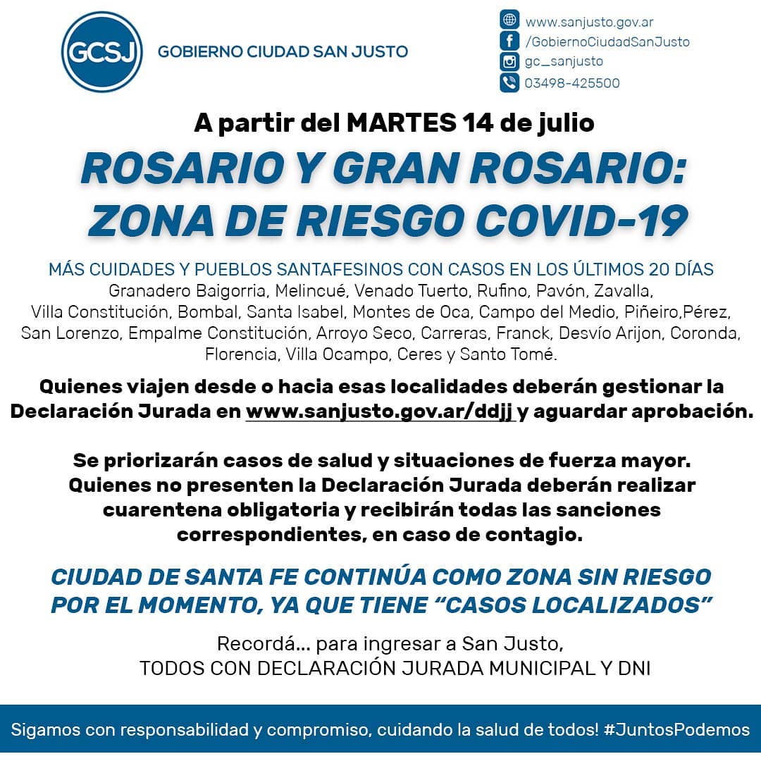 ➡️ A raíz de la gran cantidad de casos de coronavirus confirmados en la Provincia de Santa Fe, principalmente en algunos centros urbanos, la Junta de Defensa Civil de la ciudad de San Justo, ha definido a ROSARIO Y GRAN ROSARIO, como “ZONA DE RIESGO COVID-19”.