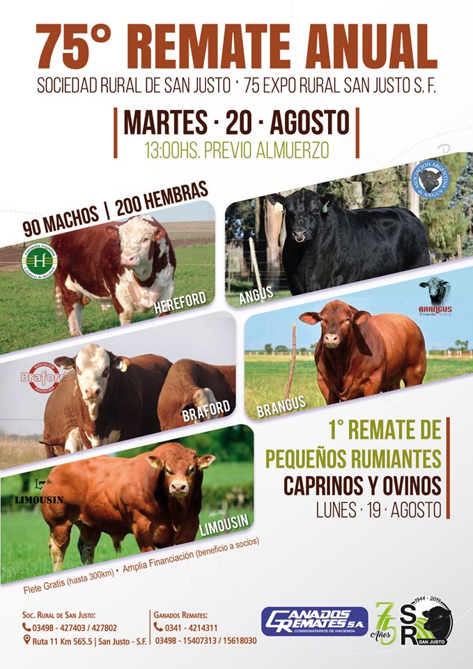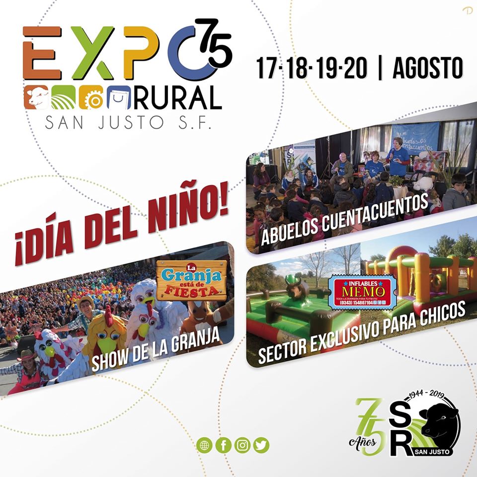 La Sociedad Rural de San Justo te invita a vivir durante 4 días – 17, 18, 19 y 20 de agosto la #ExpoRuralSJ2019, este año en su 75° Aniversario, con stands, música en vivo, el festejo del Día del Niño durante todo el fin de semana, el tradicional remate, previo almuerzo el día martes 20 de agosto.