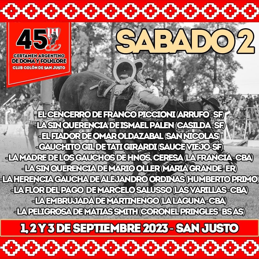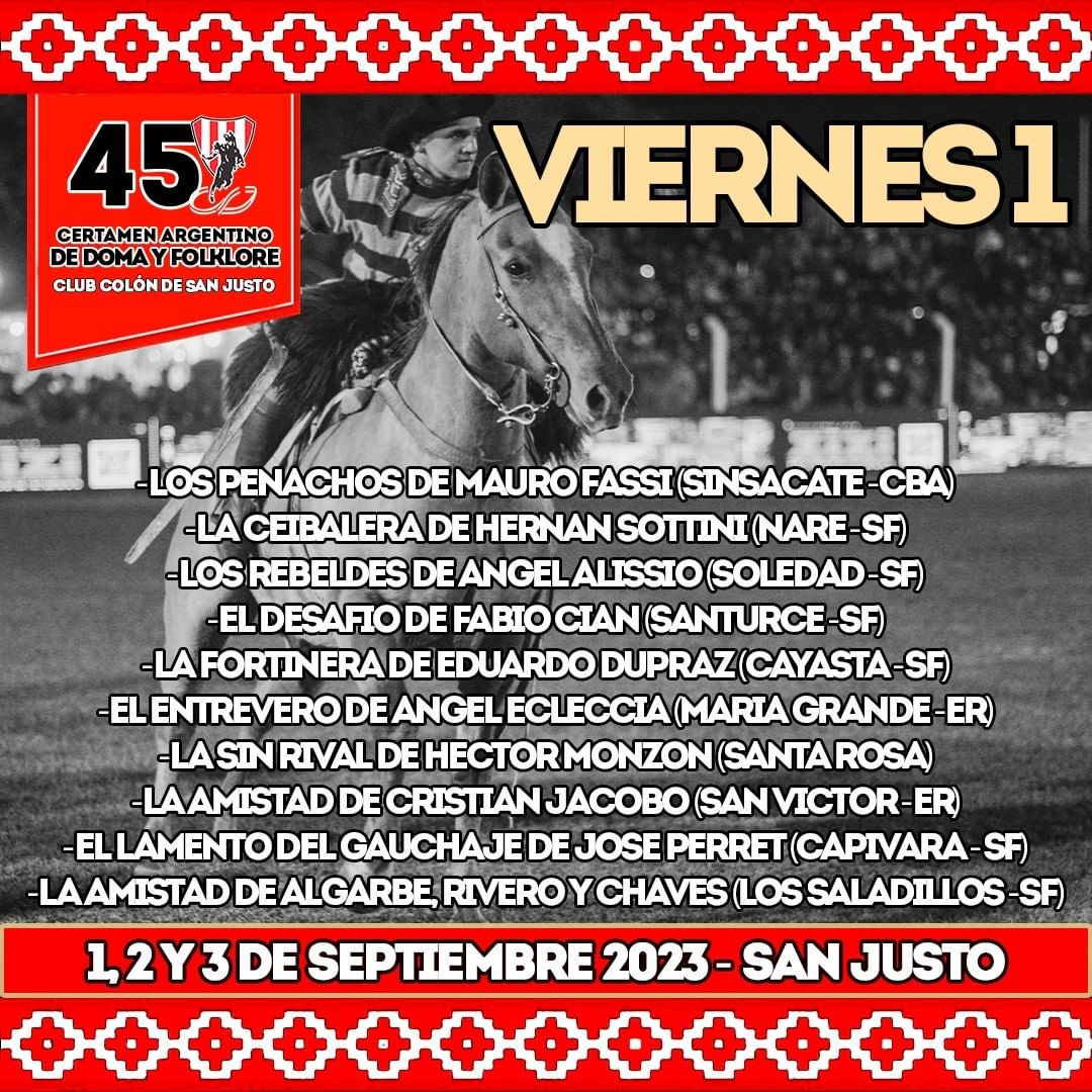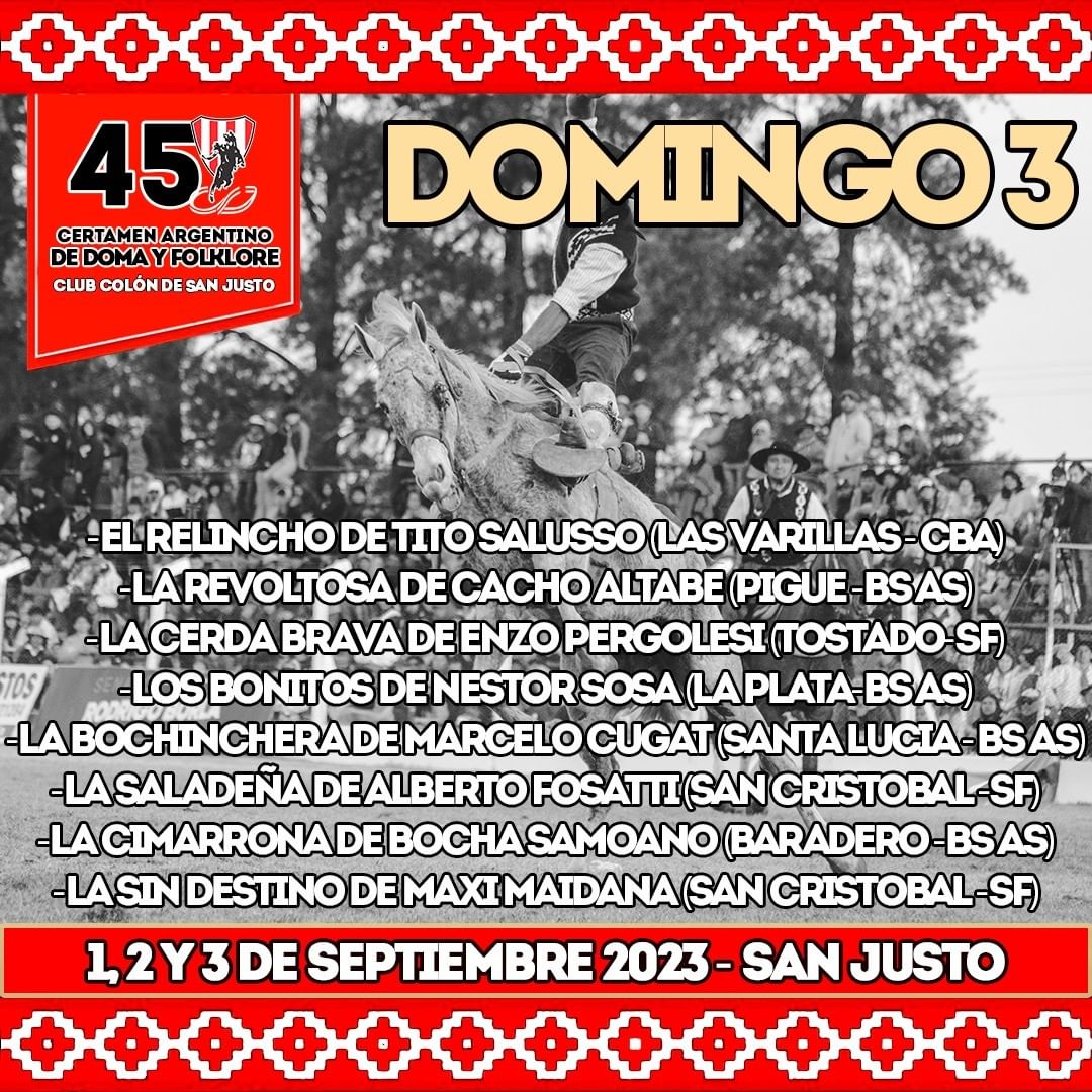 El Certamen Argentino de Doma y Folklore del Club Colón de San Justo se llevará a cabo los días 1, 2 y 3 de septiembre de 2023. Durante este emocionante fin de semana, los amantes de la tradición gaucha tendrán la oportunidad de disfrutar de tres días llenos de acción, música y folclore. Prepárate para ser cautivado por la destreza de los jinetes y la energía de las tropillas, mientras vivimos intensamente la pasión por nuestras raíces y tradiciones.
