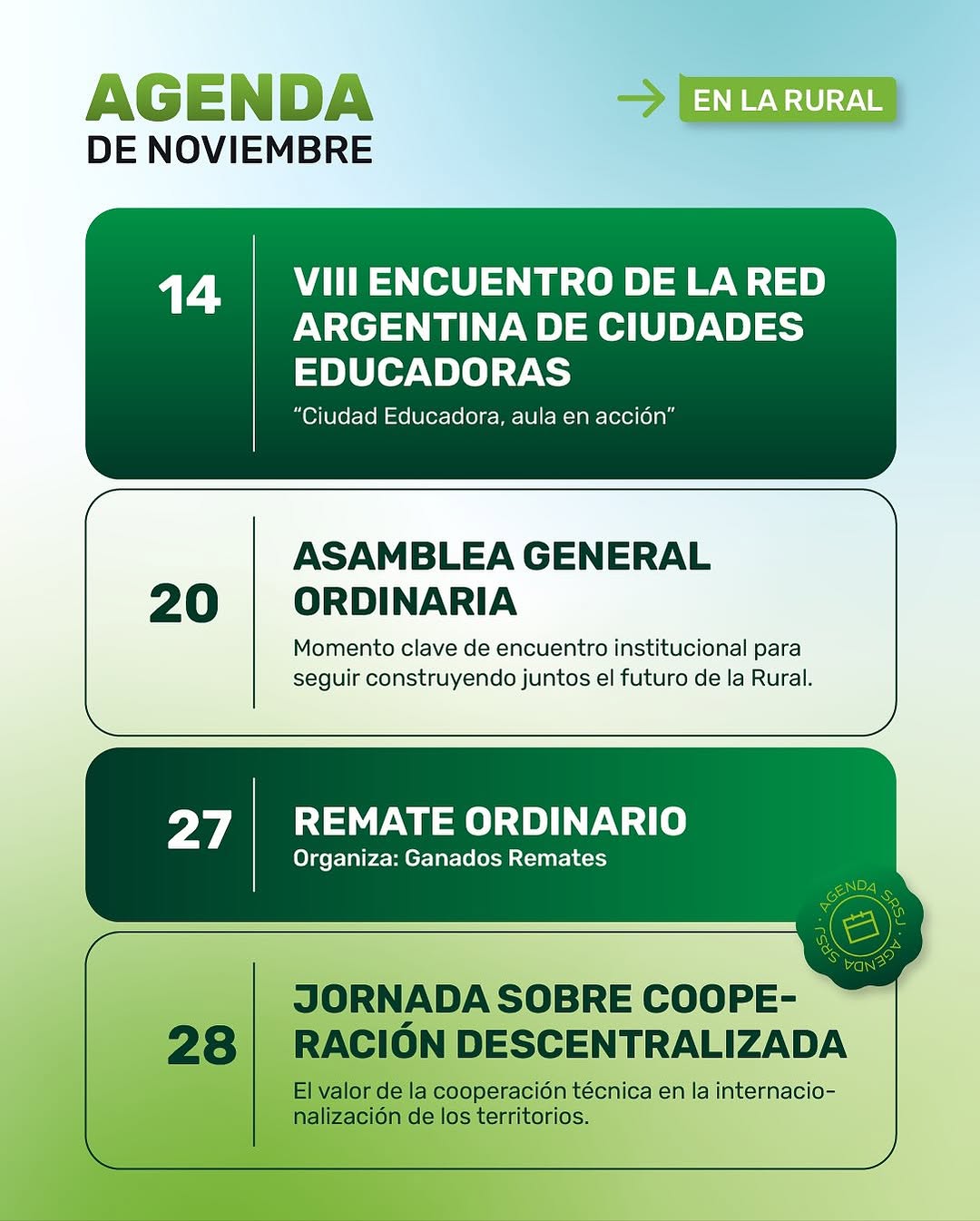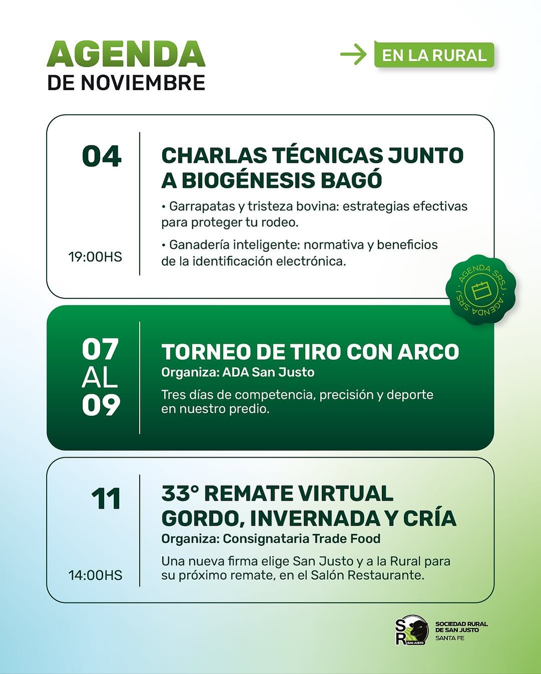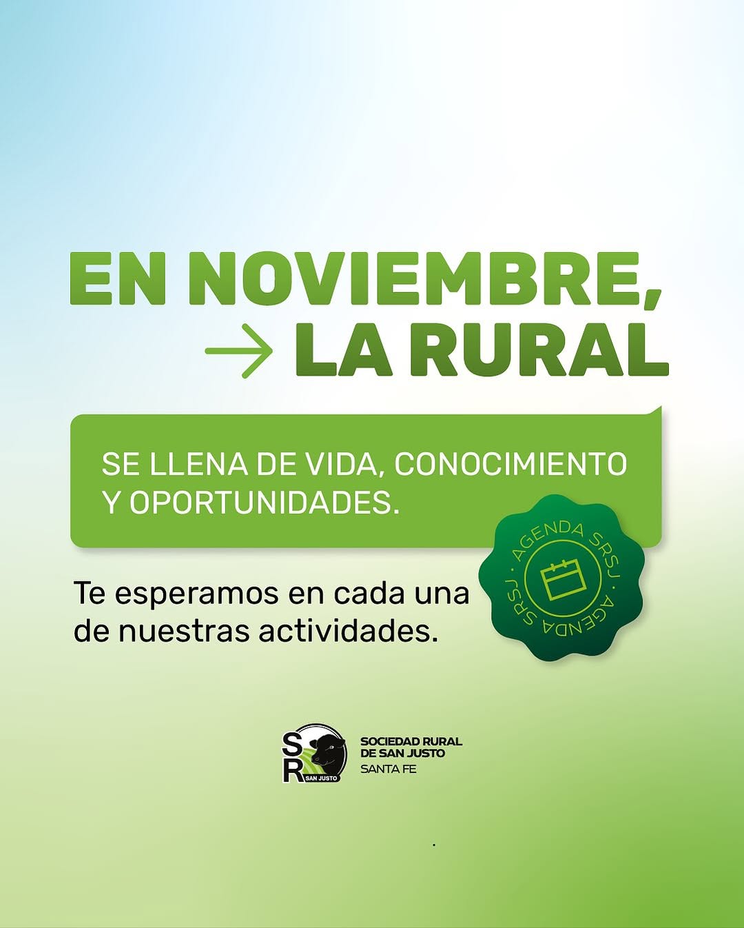 Noviembre llega con una agenda cargada de propuestas en la Sociedad Rural de San Justo. Charlas técnicas, remates, jornadas educativas, deporte y encuentros institucionales… Este mes refleja lo que somos: una institución activa, abierta y comprometida con la comunidad durante todo el año
