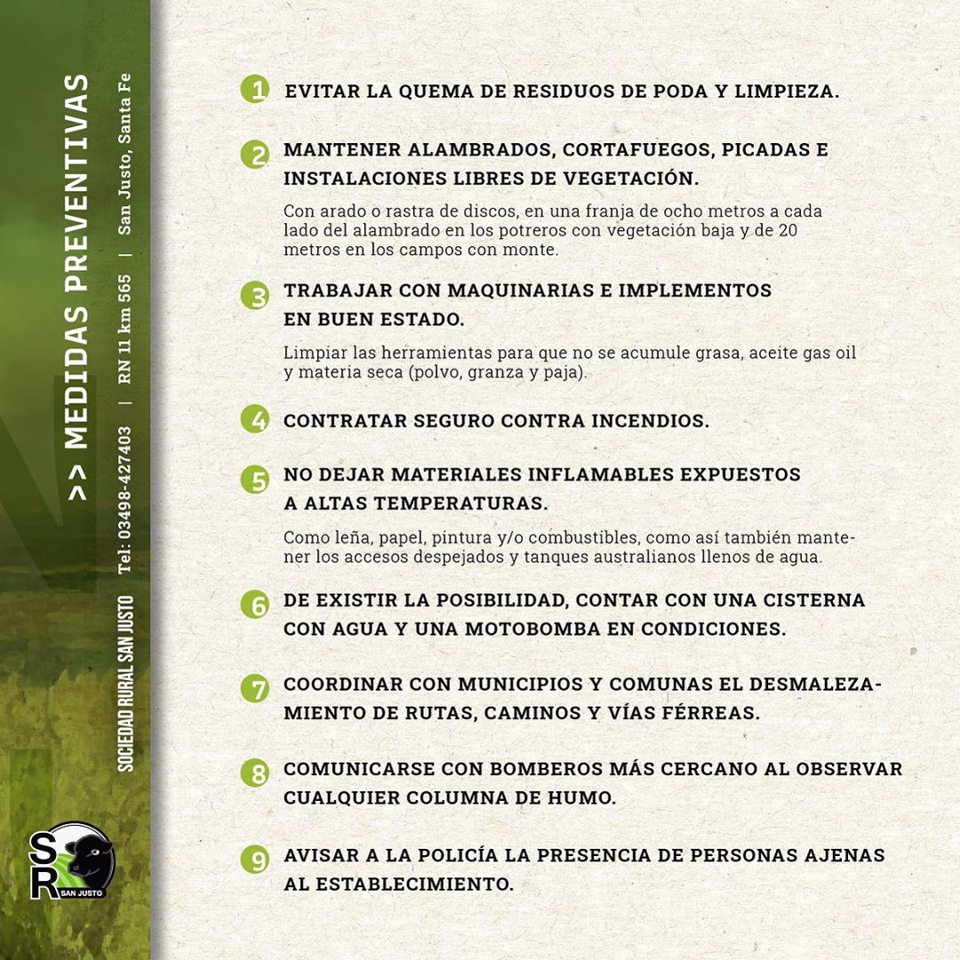Los incendios rurales nos ponen en alama ‼️. Desde la Sociedad Rural de San Justo recomendamos extremar las medidas preventivas de los mismos.