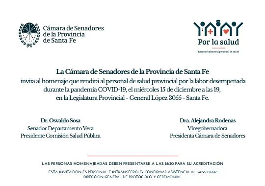 La Cámara de Senadores entregará reconocimientos a varios profesionales de San Justo y de otras localidades del Departamento, en “reconocimiento a su desempeño durante la pandemia de Coronavirus”.