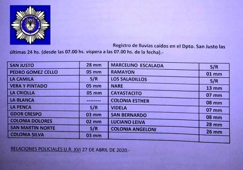 Registro de lluvia caída en el departamento San Justo, en las últimas 24 horas: