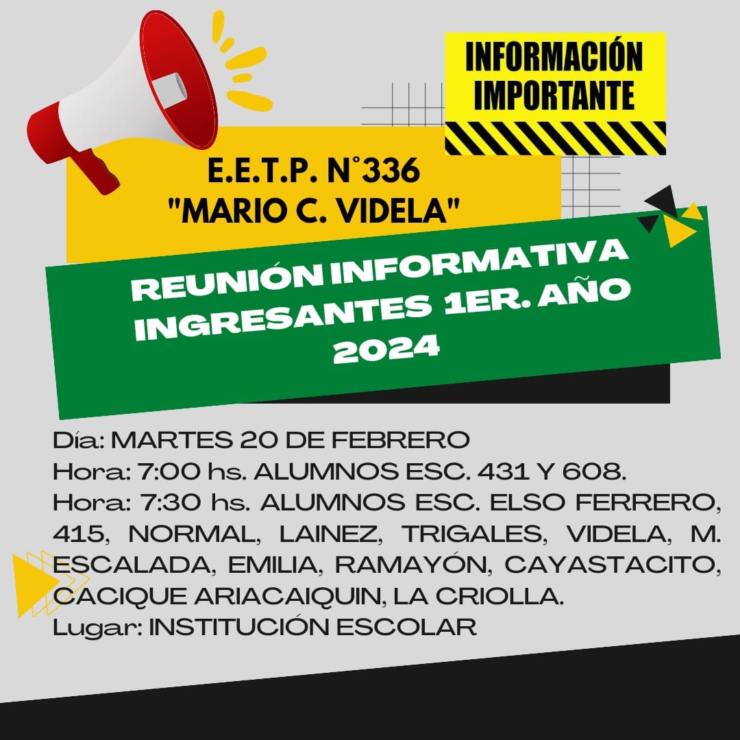 Las autoridades de la Escuela Agrotécnica N° 336 “Mario C. Videla” comunican que la reunión informativa para alumnos ingresantes a 1er año 2024, se realizará el día martes 20 de febrero próximo, en el siguiente horario: