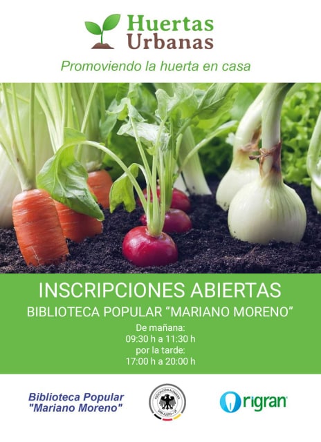 Comunicamos que sigue abierta la inscripción al Curso de Huertas Urbanas “Promoviendo la Huerta en Casa”, que se dicta en la sede de la Biblioteca Popular Mariano Moreno de nuestra ciudad.