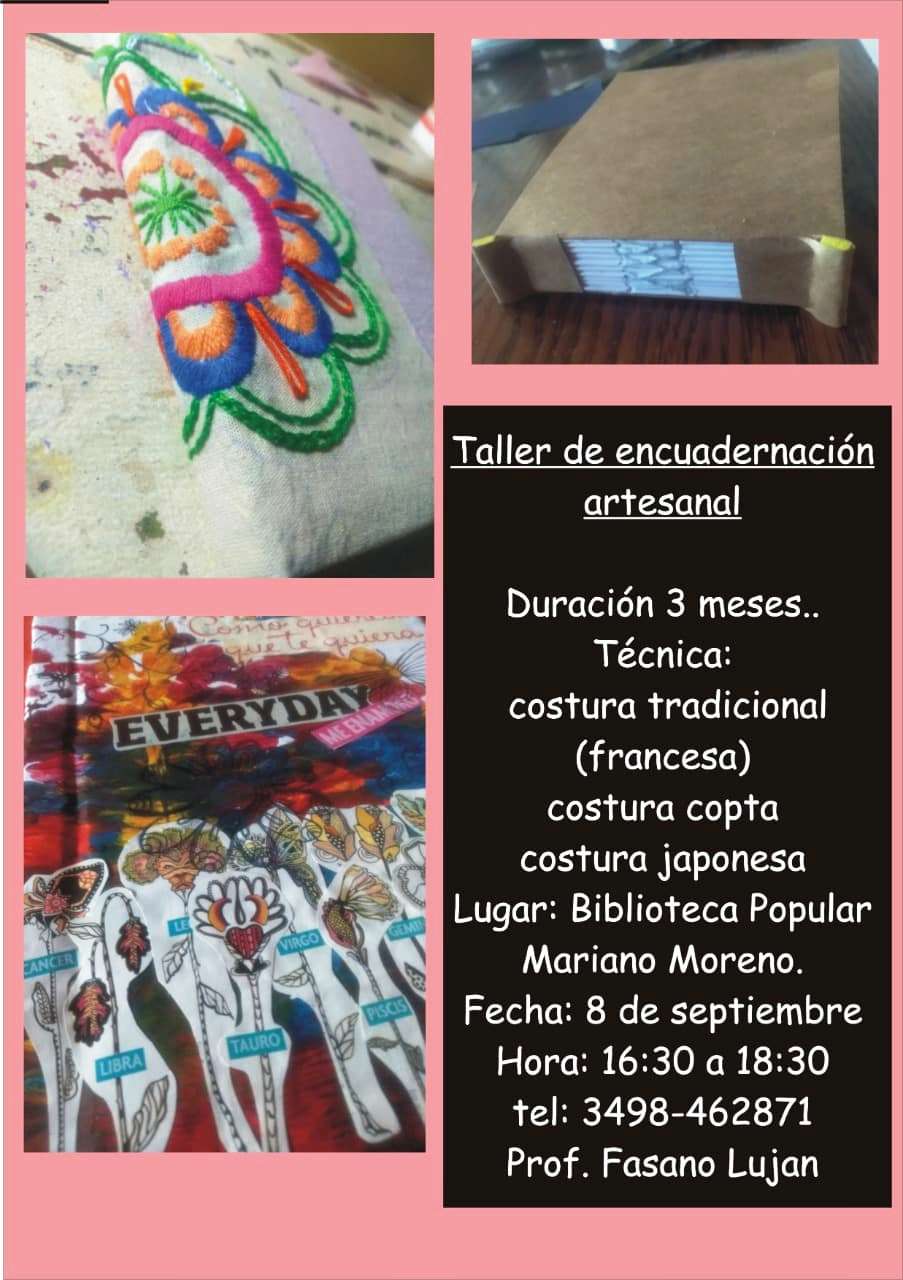 El taller tiene una duración de 3 meses y estará a cargo de la profesora Luján Fasano. La técnica a utilizar es la costura tradicional, costura copta y costura japonesa. El comienzo del mismo es el próximo 8 de septiembre de 16,30 a 18,30 horas. Para inscripciones contactarse al teléfono 03498-462871.
