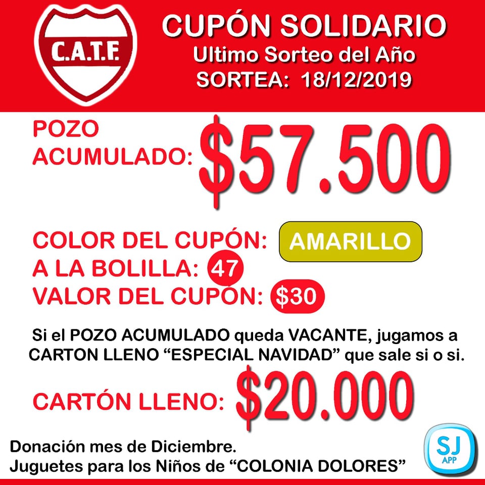 Será el miércoles 18 de diciembre, con un pozo acumulado de $ 57.500 a la bolilla 47, el cupón de color amarillo tiene un valor de $ 30 y está a la venta desde hoy jueves.