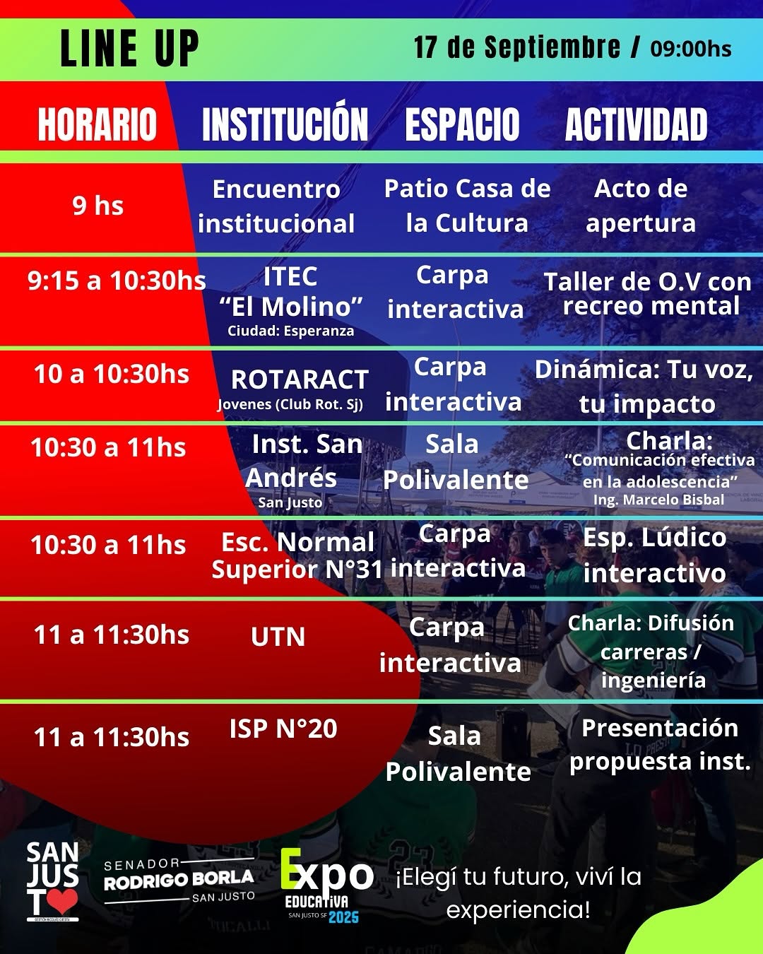 La ciudad de San Justo va a disfrutar de una edición más de ExpoEducativa. Acá te dejamos un recorrido por las diversas propuestas que se van a desarrollar ese día, un line up completo, con sus horarios e instituciones que nos van a deleitar con sus presentaciones.