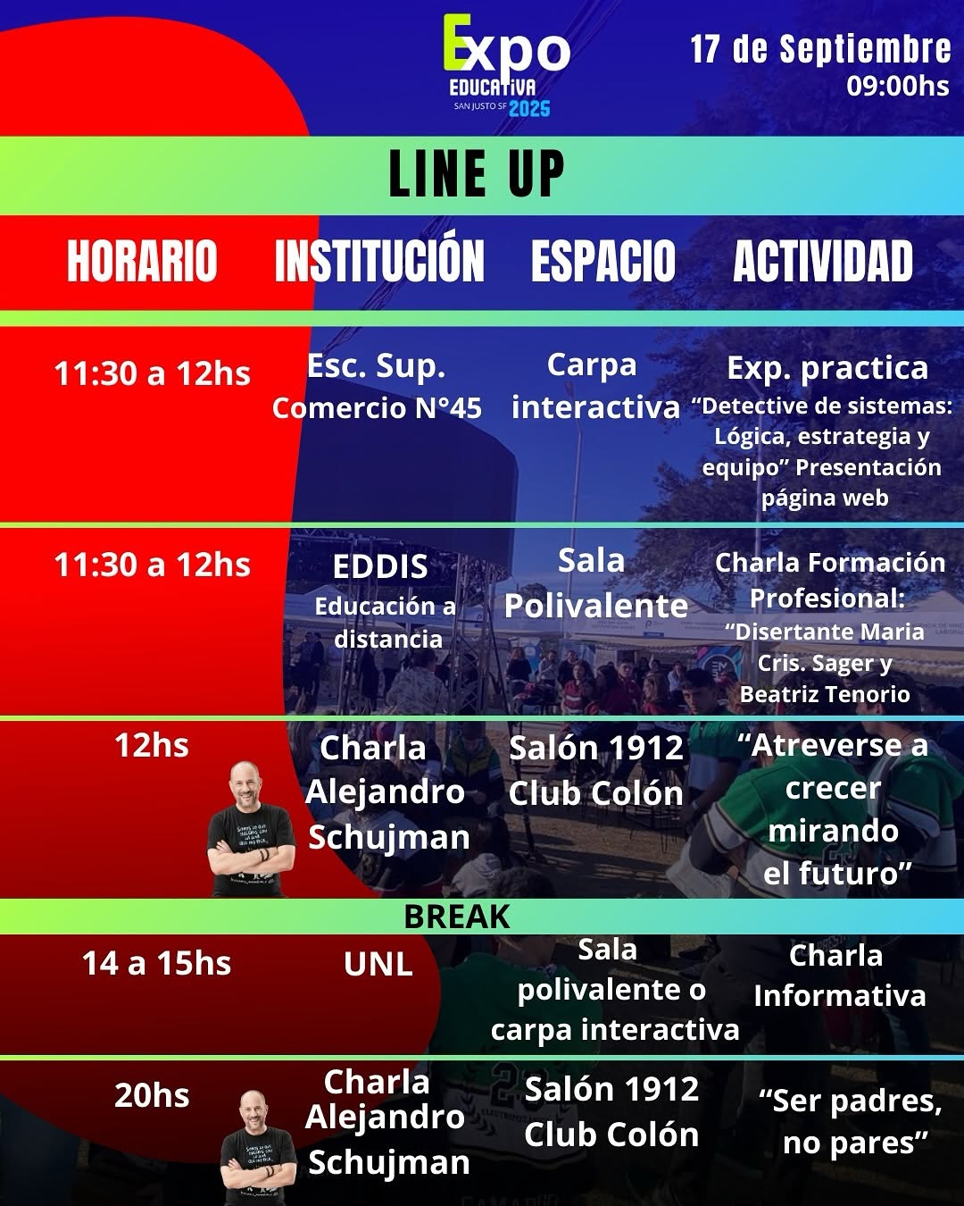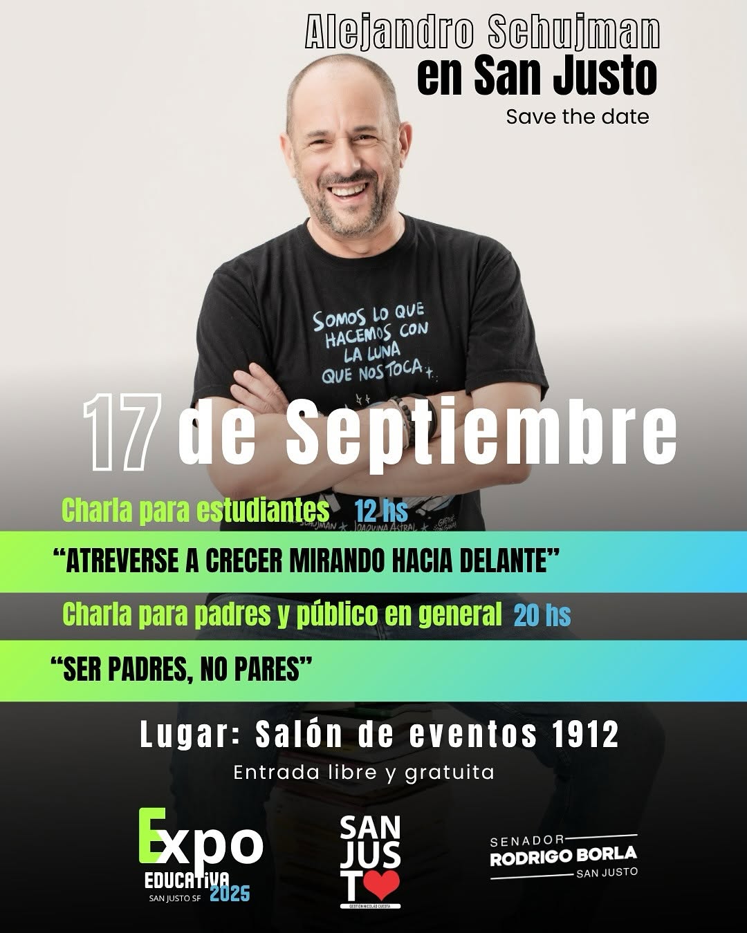 También vamos a tener el placer de vivir y escuchar dos charlas de la mano de @alejandroschujman, una para estudiantes y otra para padres. Vení y Viví la experiencia educativa educativa de la ciudad de San Justo y toda la región. Sigamos transformando con Educación de calidad.