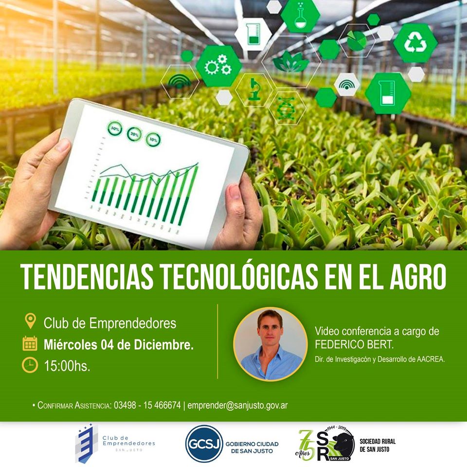 La Sociedad Rural de San Justo junto a Emprender y el Gobierno Ciudad de San Justo invitan a participar de la videoconferencia “TENDENCIAS TECNOLÓGICAS EN EL AGRO” a cargo de Federico Bert.
