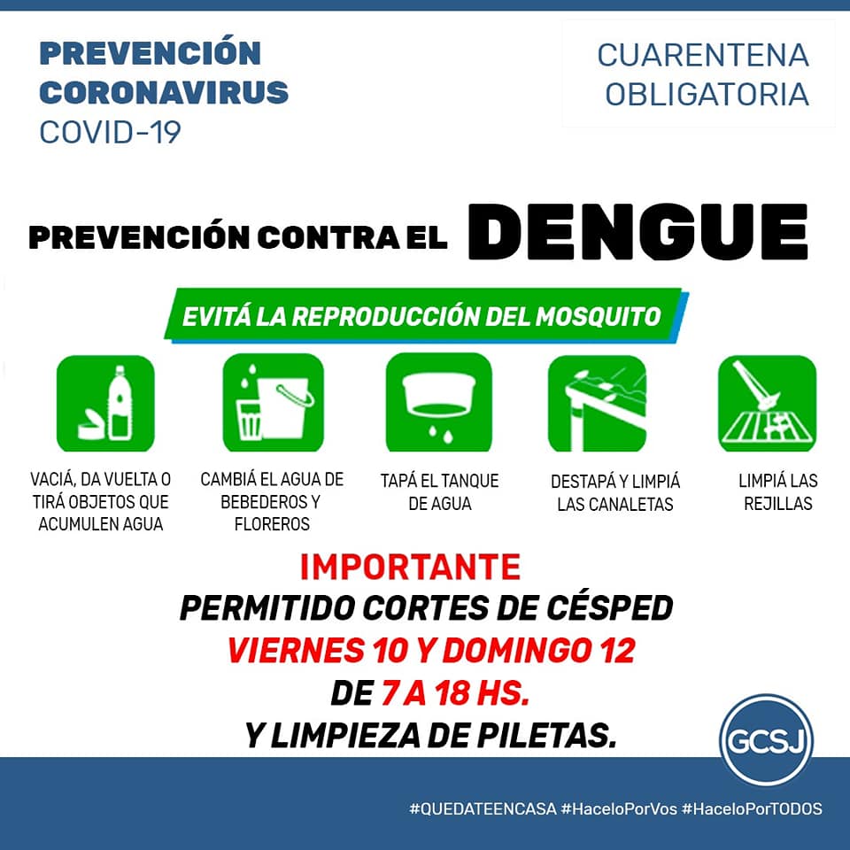 ➡️ Por otra parte, tanto el viernes como el próximo domingo, en prevención al DENGUE🦟 y para evitar la proliferación de otra enfermedad que acecha en distintos puntos de nuestro país y que afortunadamente no ha llegado a San Justo, el GCSJ posibilitará realizar tareas vinculadas a la sanidad e higiene. Es por eso que se habilitará a los cortadores de pasto, poder trabajar con normalidad.