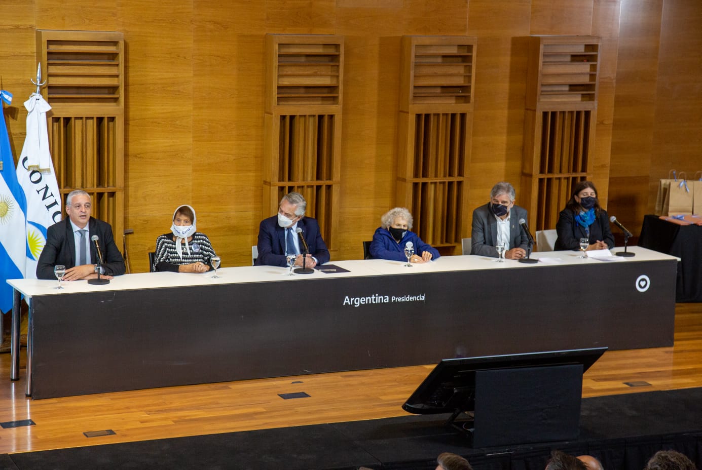 En el escenario, junto a Fernández, Filmus y Pietragalla Corti, estuvieron la titular de Familiares de Desaparecidos y Detenidos, Angela “Lita” Paolin de Boitano; la representante de Madres de Plaza de Mayo-Línea Fundadora, Taty Almeida y la presidenta del CONICET, Ana Franchi.