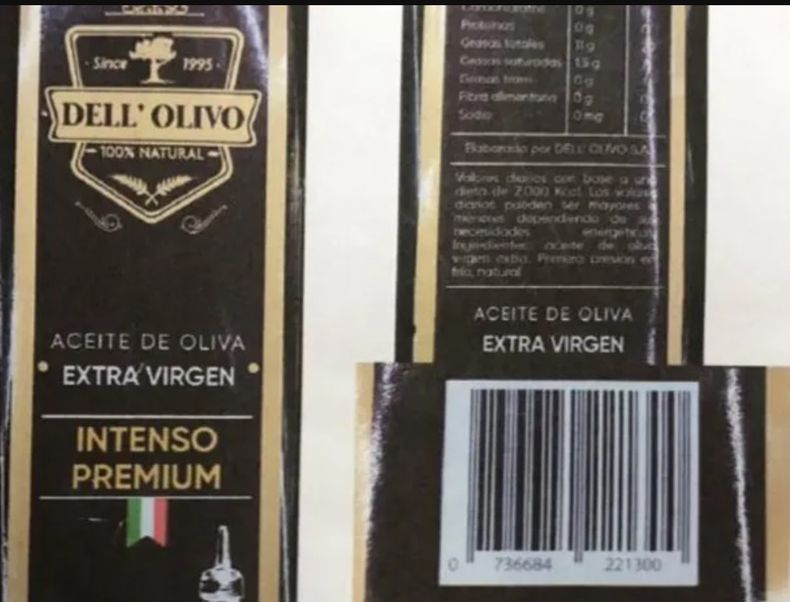 “Prohíbase la elaboración, fraccionamiento y comercialización en todo el territorio nacional y en plataformas de venta en línea del producto: Aceite de oliva extra virgen – Intenso Premium – marca Dell’ Olivo – Elaborado por Dell’ Olivo S.A – RNE N° 04055381, RNPA N° 04066198, en cualquier presentación, lote y fecha de vencimiento, por carecer de registros sanitarios y estar falsamente rotulado al indicar un RNE inexistente y un RNPA correspondiente a otro producto, resultando ser un producto ilegal”, detalló ANMAT.