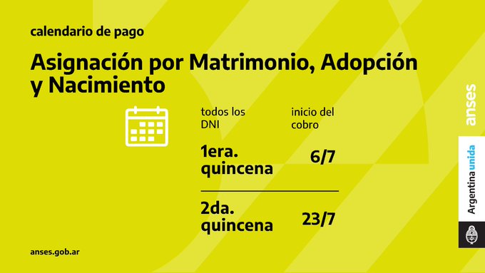 - Asignación por Matrimonio, Adopción y Nacimiento 1ra. Quincena – 6/7 2da Quincena 23/7