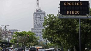 El Gobierno porteño dispuso iluminar monumentos y fachadas de edificios de la Ciudad de Buenos Aires con los colores de la bandera argentina, en homenaje a Diego Armando Maradona, que falleció este miércoles a los 60 años a causa de paro cardiorespiratorio.