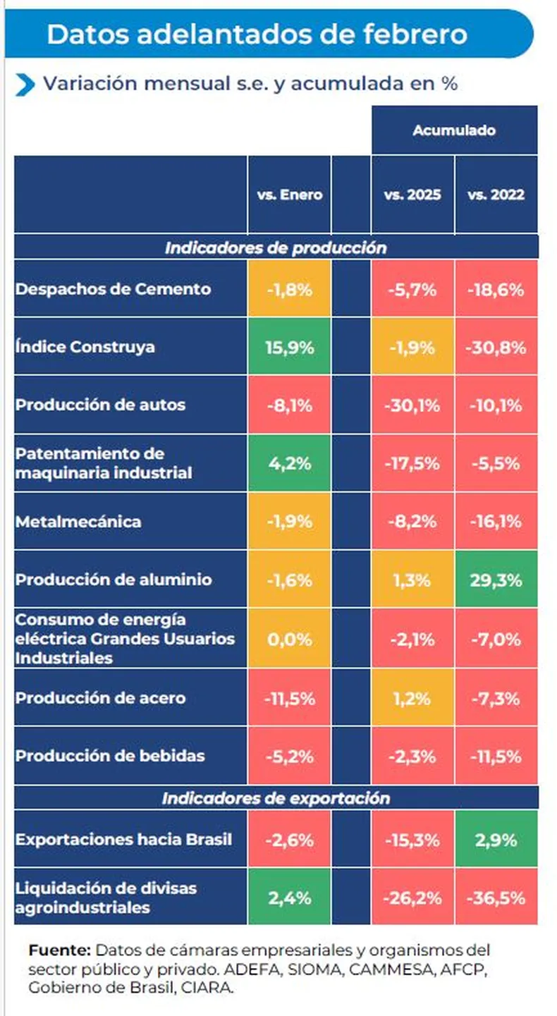 Por su parte, el informe elaborado por el centro de estudios de la Unión Industrial Argentina (UIA) confirma que que la industria es el sector más golpeado, con una caída interanual en torno al 3% para febrero, en tanto en la comparación mensual se prevé un nivel similar respecto a enero -0,8%.