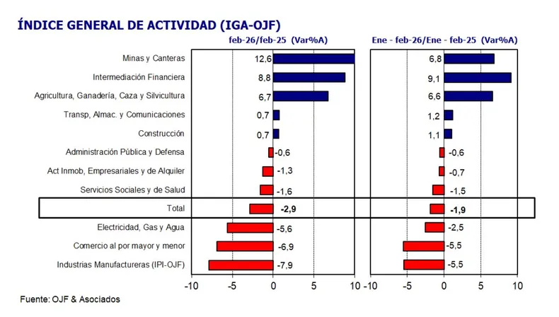 “El fuerte impulso que muestran los sectores de minas y canteras, el agro y la intermediación financiera no alcanzaron a revertir la cifra negativa del segundo mes del año”, lamentaron. De cara a los próximos meses, adelantan que esperan “seguir viendo una marcha de la actividad a dos velocidades”.
