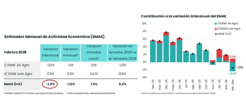 En este marco, el Estimador Mensual de Actividad Económica (EMAE) realizado por la consultora Equilibra también le trajo malas noticias al Gobierno: en febrero sufrió una caída del 1% respecto a enero, y -1,5% a nivel interanual. “Luego de la brusca suba desestacionalizada de diciembre y enero (+2,3% vs nov-25), la actividad agregada se habría contraído influenciada por la menor cantidad de días hábiles (2 menos que en febrero 2025 por feriados de carnaval)”,argumentan.