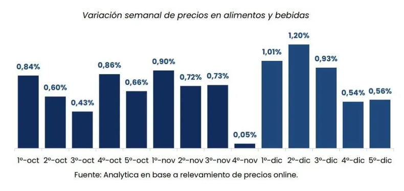 Durante la quinta semana de diciembre, los precios de alimentos y bebidas registraron un incremento semanal de 0,6% en el Gran Buenos Aires, según los relevamientos de Analytica y LCG. La coincidencia se da en el dato puntual, aunque las estimaciones difieren al observar el promedio de las últimas cuatro semanas.