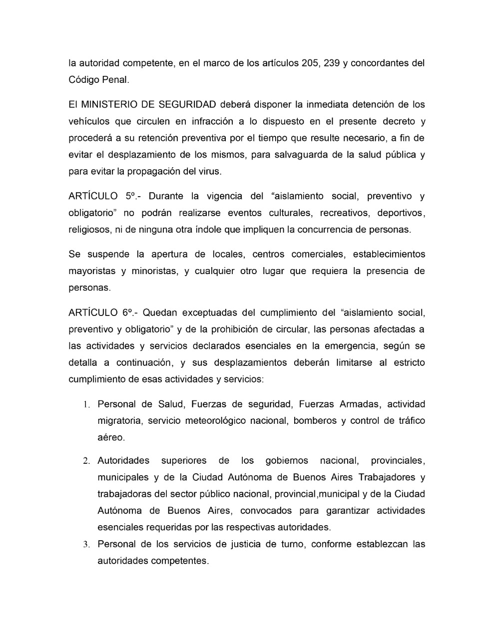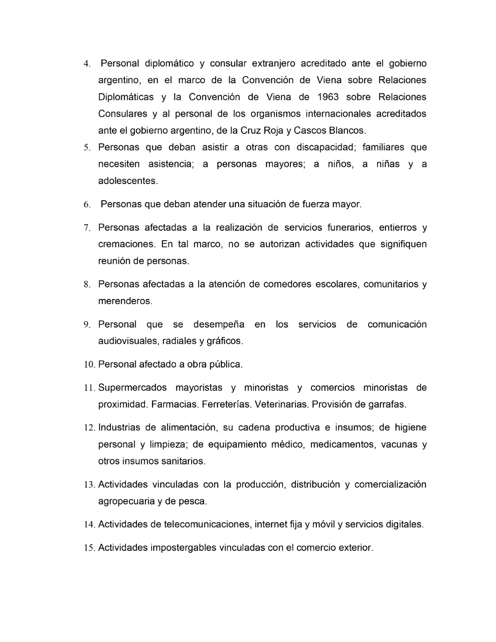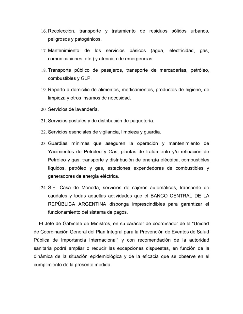 Exceptuadas del aislamiento: Salud, Seguridad, Defensa, Migraciones, Bomberos, autoridades superiores del estado, gobierno nacional, gobiernos provinciales y municipales «en los niveles de conducción política», justicia (mínimo), diplomático.