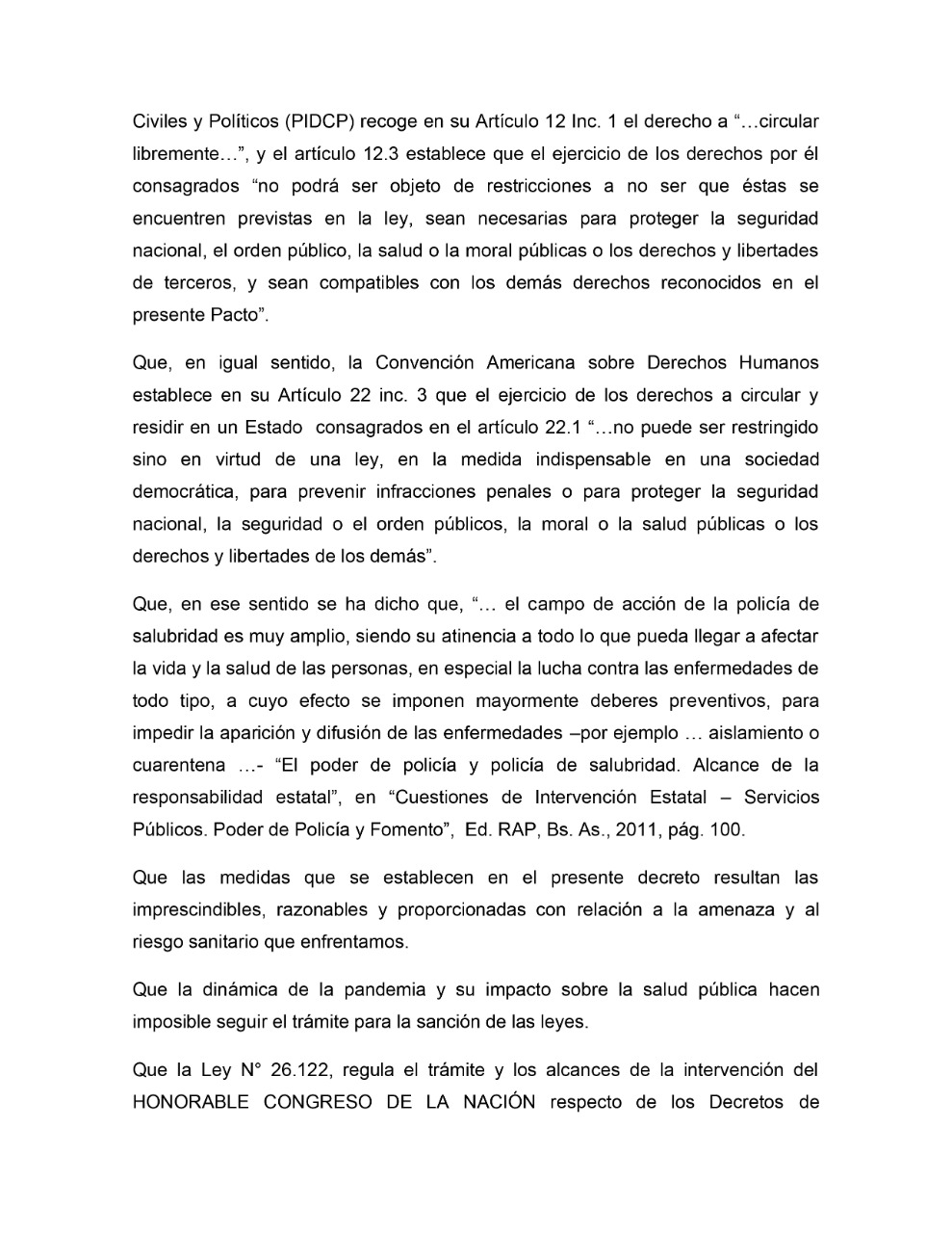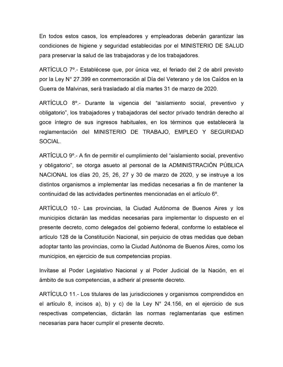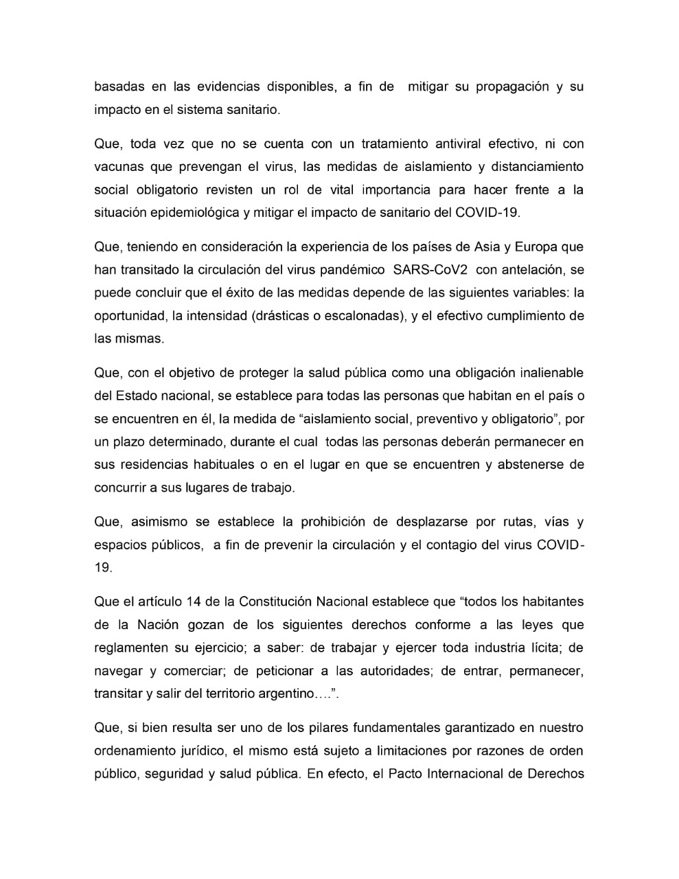 Exceptuadas del aislamiento: Salud, Seguridad, Defensa, Migraciones, Bomberos, autoridades superiores del estado, gobierno nacional, gobiernos provinciales y municipales «en los niveles de conducción política», justicia (mínimo), diplomático.
