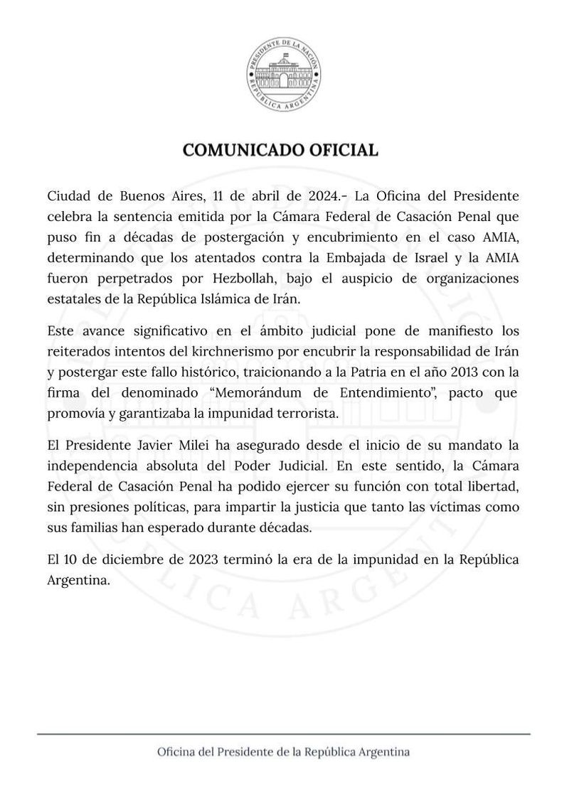 Además, destacaron que “el Presidente Javier Milei ha asegurado desde el inicio de su mandato la independencia absoluta del Poder Judicial“. “La Cámara Federal de Casación Penal ha podido ejercer su función con total libertad, sin presiones políticas, para impartir la justicia que tanto las víctimas como sus familias han esperado durante décadas”, agregaron.