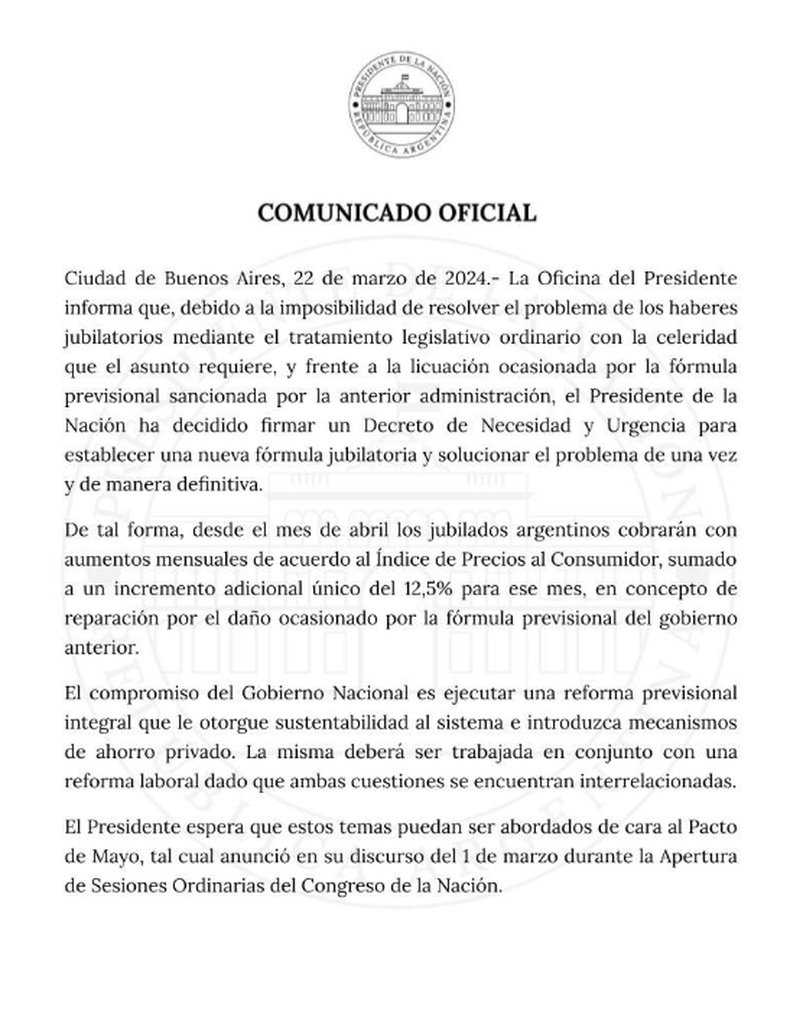 A través de un comunicado de la Oficina de Presidencia, el Gobierno destacó la decisión del presidente Javier Milei de promover un DNU para establecer una nueva fórmula jubilatoria que incluirá un incremento adicional del 12,5% en abril, aduciendo reparar “el daño ocasionado por la formula previsional del gobierno anterior”.