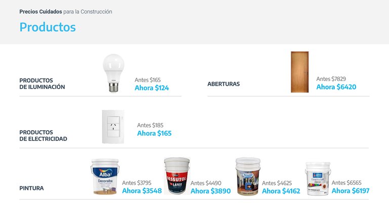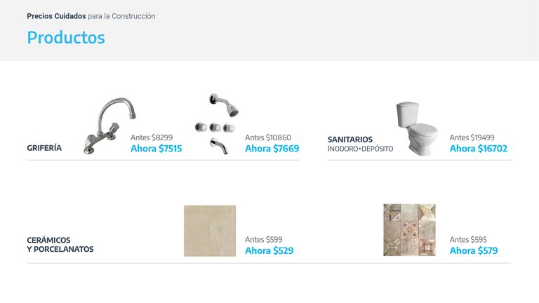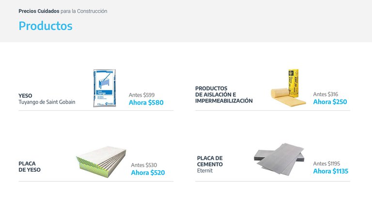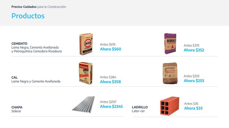 Algunos de los precios del programa: bolsa de cemento (Loma Negra) a $560 (antes $619); bolsa de cal, a $358 (antes a $384); chapa (Siderar), a $2.345 (antres $2.517); ladrillos, a $33 (antes a $36); placa de cemento, a $1.135 (antes de $1.195); grifería por $ 7.515 (antes a $8.299); inodoros a $16.702 (antes $19.499), entre otros productos. La lista completa se puede consultar en la página www.argentina.gob.ar/precios-cuidados/construccion.