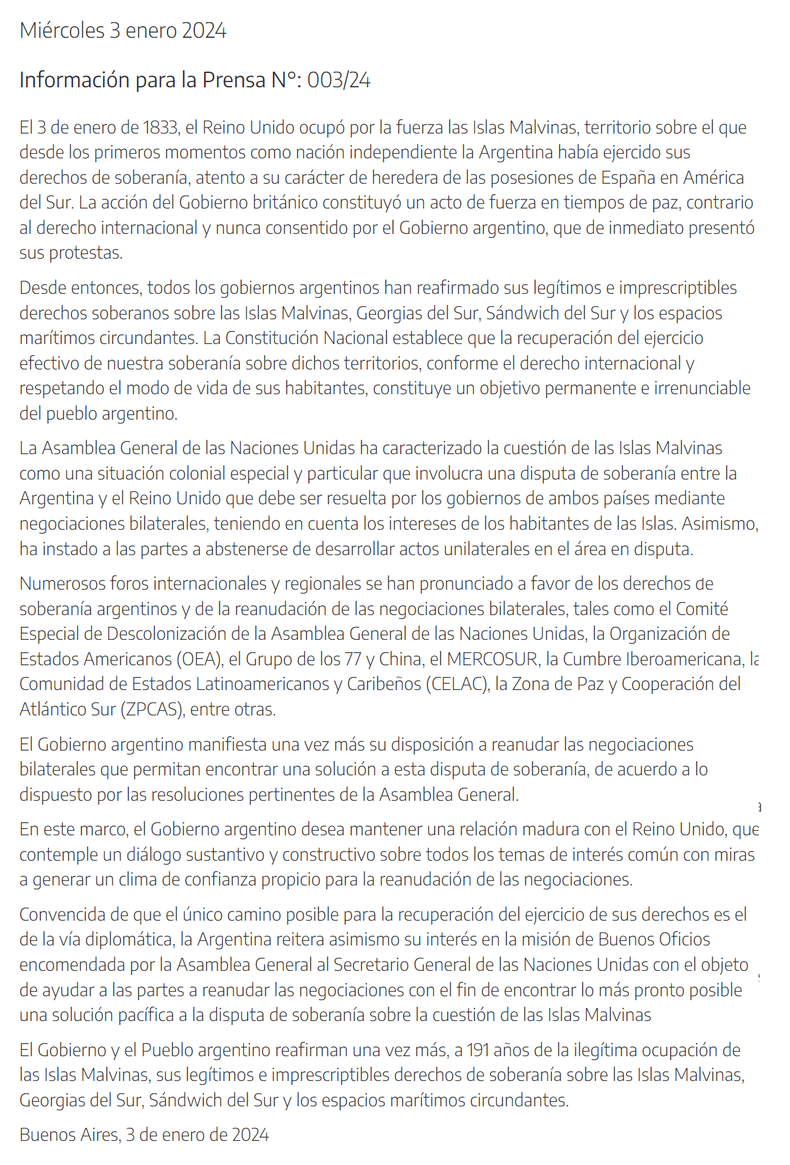 “El Gobierno y el pueblo argentino reafirman una vez más, a 191 años de la ilegítima ocupación de las Islas Malvinas, sus legítimos e imprescriptibles derechos de soberanía sobre las Islas Malvinas, Georgias del Sur, Sándwich del Sur y los espacios marítimos circundantes”, concluye el comunicado oficial.