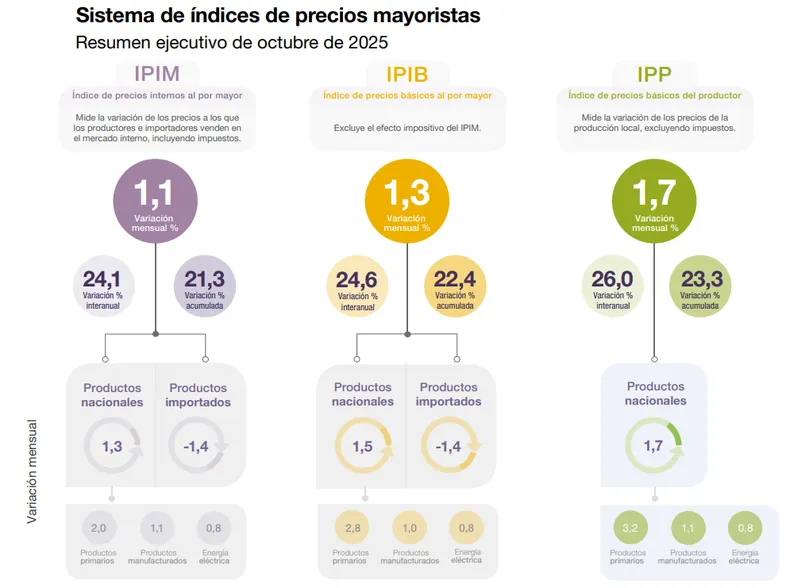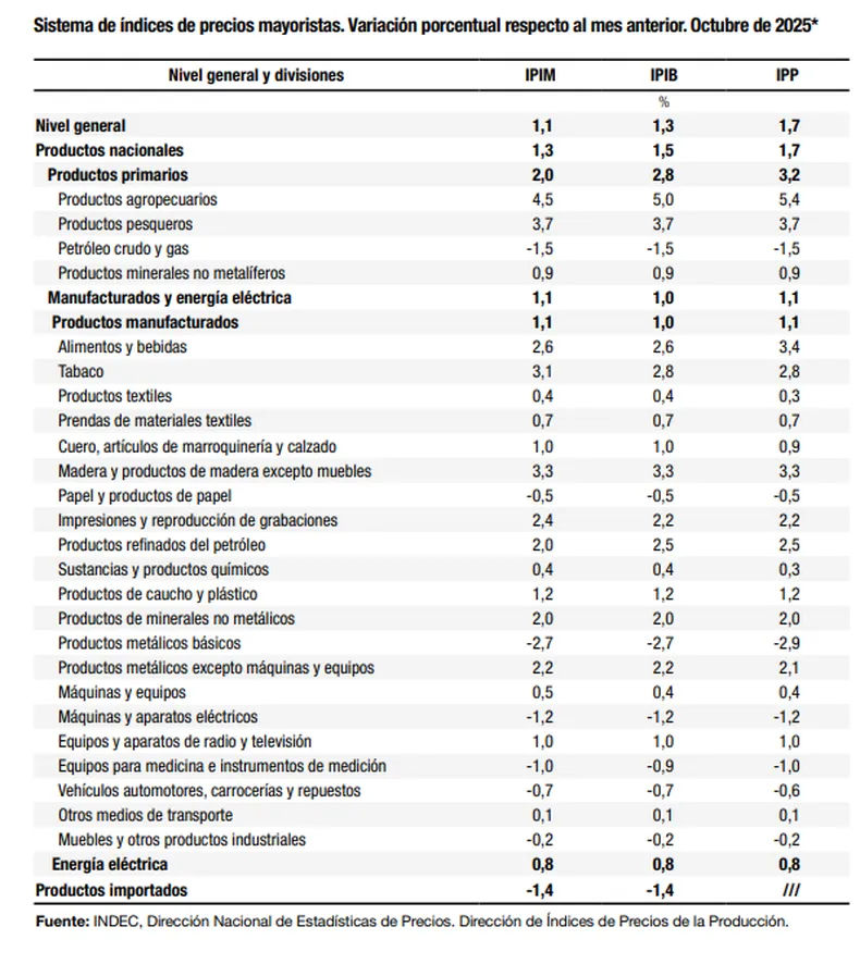 El Índice de precios internos al por mayor (IPIM) registró en octubre un aumento de 1,1% respecto del mes anterior, según informó este martes el Instituto Nacional de Estadística y Censos (Indec). La variación fue consecuencia de un incremento de 1,3% en los “Productos nacionales” y la baja de 1,4% en los “Productos importados”.