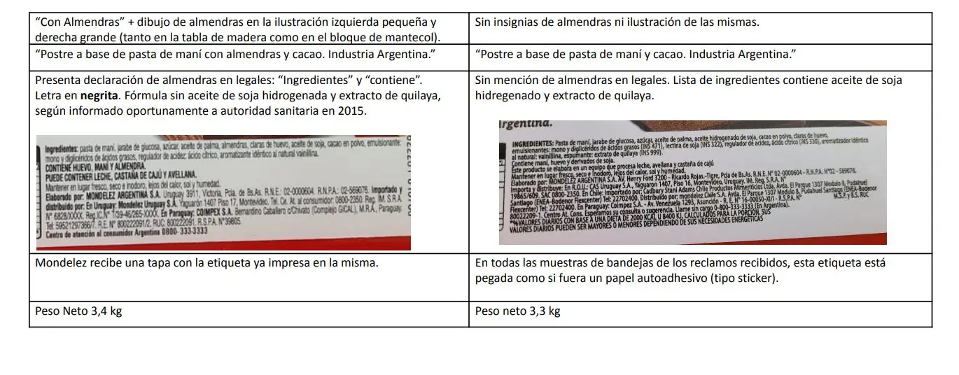 Por otra parte, el Mantecol trucho se identifica como “Postre a base de pasta de maní y cacao”, mientras que el legítimo indica “Postre a base de pasta de maní con almendras y cacao”. Siguiendo por la misma línea, tampoco posee insignias ni ilustraciones que indique “con almendras”.