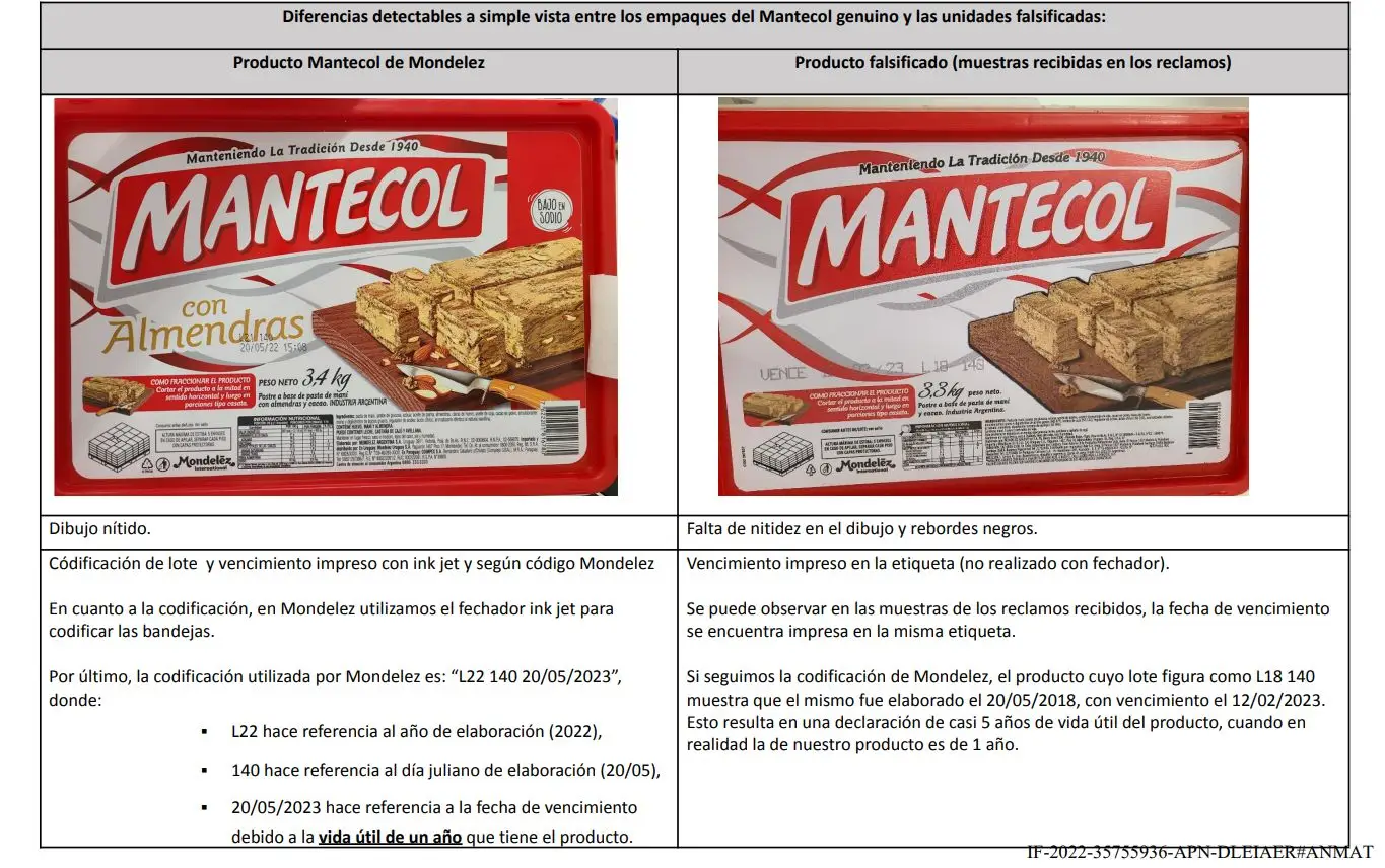 Al mismo tiempo, desde el Boletín Oficial se destacan los elementos diferenciales entre ambos productos. En primer lugar, la golosina adulterada presenta un peso neto diferente al que se comercializa en la actualidad; además la imagen del Mantecol es poco nítida con bordes negros.