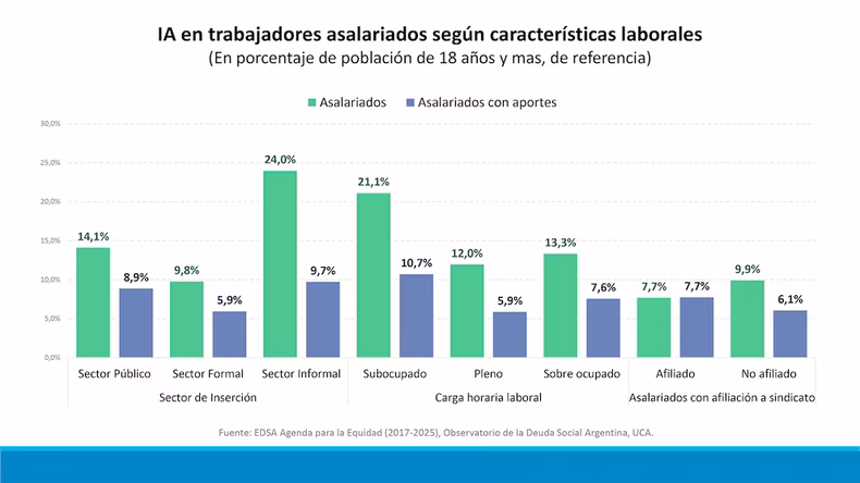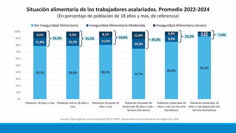 ncuentra afectada (15,2% de incidencia total), aunque lo más preocupante es que el problema llega a los sectores formalizados: el 7% de los trabajadores asalariados con empleo formal (con aportes) sufren inseguridad alimentaria. En cambio, los ocupados no asalariados y trabajadores de servicio doméstico alcanza un 25,3%, la proporción más alta registrada entre los segmentos evaluados.
