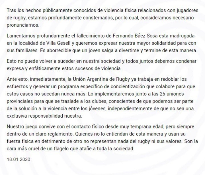 La Unión Argentina de Rugby (UAR) lanzó un comunicado para repudiar la muerte de Fernando Báez Sosa en Villa Gesell y anunciar un programa de concientización en pos de erradicar este tipo situaciones violentas.