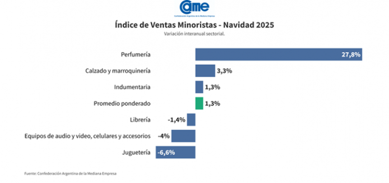 La Confederación Argentina de la Mediana Empresa (CAME) informó este jueves que las ventas minoristas pymes tuvieron en Navidad una suba interanual del 1,3%, impulsada principalmente por la oferta de financiación en cuotas y promociones específicas. El gasto promedio se ubicó en los $36.266.