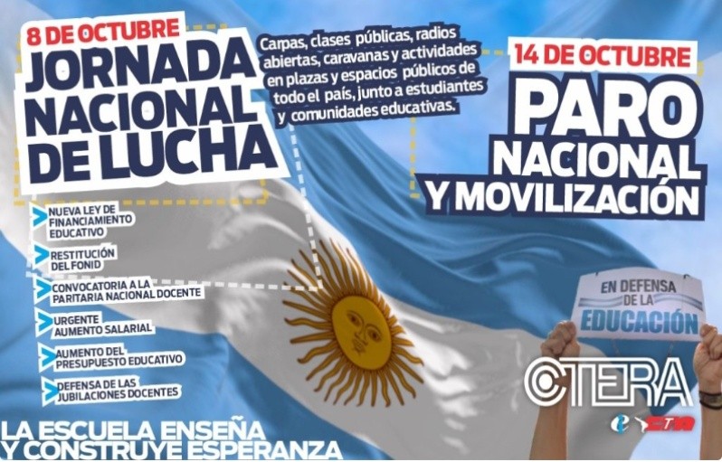 Este lunes, la Confederación de docentes de las escuelas públicas (Ctera), anunció la realización de una jornada nacional de lucha para el miércoles 8 de octubre y un paro nacional docente para el martes 14 de octubre.