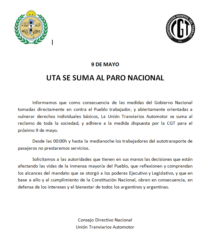 La Unión de Tranviarios Automotor (UTA) confirmó que se adhiere al paro de transporte del 9 de mayo. Mediante un comunicado oficial informaron que las medidas tomadas por el gobierno de Javier Milei son “en contra del pueblo trabajador”. Por lo que no prestarán servicios el próximo jueves.