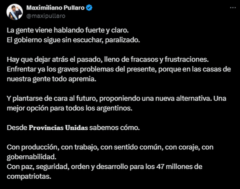 “La gente viene hablando fuerte y claro. El gobierno sigue sin escuchar, paralizado. Hay que dejar atrás el pasado, lleno de fracasos y frustraciones. Enfrentar ya los graves problemas del presente, porque en las casas de nuestra gente todo apremia”, escribió Pullaro en su cuenta de X.