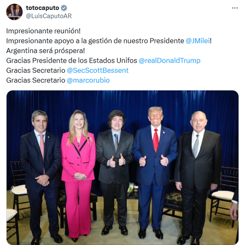 El presidente Javier Milei se reunió este martes en Estados Unidos con Donald Trump, en el marco de la Asamblea General de la ONU. El encuentro con el líder republicano, que ya había manifestado públicamente su respaldo a la Casa Rosada, se produce en medio de la crisis más grave que atraviesa el gobierno argentino desde su llegada al poder.Las denuncias de corrupción en la Agencia Nacional de Discapacidad, el escándalo por las muertes vinculadas al consumo de fentanilo contaminado, la derrota electoral en la provincia de Buenos Aires, las sucesivas caídas de vetos presidenciales en el Congreso y una creciente inestabilidad económica y financiera forman el telón de fondo de la bilateral.Milei viajó acompañado por la secretaria general de la Presidencia, Karina Milei; el ministro de Economía, Luis Caputo; y el canciller Gerardo Werthein. En la reunión, Trump ratificó su apoyo político y la disposición de su administración a facilitar auxilio financiero, en un contexto en el que la Argentina debe afrontar vencimientos de deuda por 4.000 millones de dólares en enero y otros 4.500 millones en julio de 2026.“Impresionante reunión! Impresionante apoyo a la gestión de nuestro Presidente Javier Milei! ¡Argentina será próspera! Gracias Presidente de los Estados Unidos Donald Trump. Gracias secretario del Tesoro Scott Bessent. Gracias secretario de Estado Marco Rubio”, tuiteó Caputo al término de la reunión. “No se imaginan lo emocionante que fue la reunión”, agregó en otra publicación.