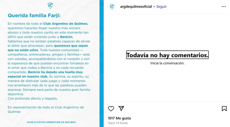 “Queremos hacerles llegar nuestro más sincero abrazo y todo nuestro cariño en este momento tan difícil que están viviendo junto a Benicio. Sabemos que existen palabras capaces de aliviar el dolor que atraviesa, pero queremos que sepan que no están solos”, comenzó el escrito.