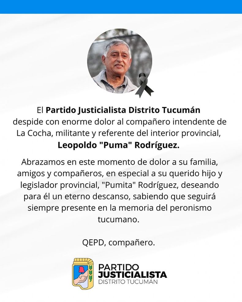 Por su parte, el Partido Justicialista de Tucumán también despidieron al mandatario municipal: “El Partido Justicialista Tucumán despide con enorme dolor al compañero intendente de La Cocha, militante y referente del interior provincial, Leopoldo Puma Rodríguez”.