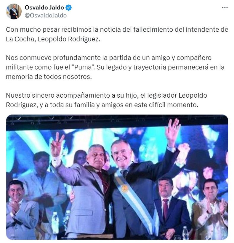 A través de las redes sociales, el gobernador de Tucumán, Osvaldo Jaldo, confirmó la muerte del intendente de La Cocha, Leopoldo “Puma” Rodríguez: “Con mucho pesar recibimos la noticia del fallecimiento del intendente de La Cocha, Leopoldo Rodríguez”.