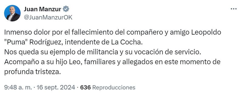 En tanto, el senador tucumano, Juan Manzur también lamentó la muerte del intendente Rodríguez. “Inmenso dolor por el fallecimiento del compañero y amigo Leopoldo “Puma” Rodríguez, intendente de La Cocha”, expresó en su cuenta de X.