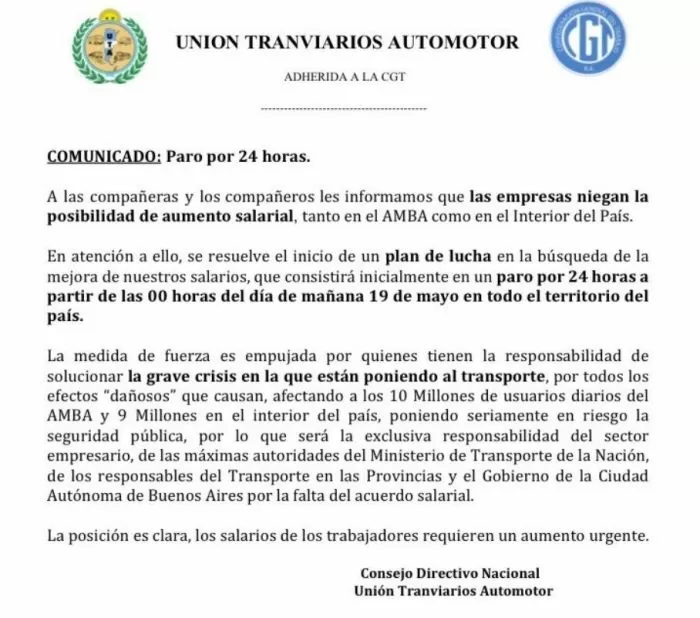 Mediante un comunicado dado a conocer este jueves por la tarde, UTA expresó que “las empresas niegan la posibilidad de aumento salarial, tanto en el AMBA como en el interior del país” por lo que “se resuelve el inicio de un plan de lucha en la búsqueda de la mejora de nuestros salarios, que consistirá inicialmente en un paro por 24 horas a partir de las 00 horas del día de mañana 19 de mayo en todo el territorio del país”.