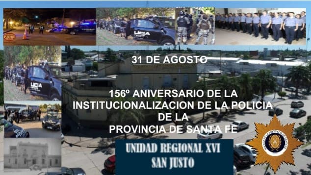 En el día del “156° Aniversario de la Institucionalización de la Policía de la Provincia de Santa Fe”, el Señor Jefe de Unidad Regional XVI San Justo, Subdirector de Policía EDUARDO JAVIER ARIAS, junto al Señor Subjefe, Subdirector de Policía CRISTIAN PABLO MANGINI, hacen llegar un saludo fraterno y cordial a todo el personal policial del departamento San Justo, como así, a todos los hombres y mujeres que conforman las distintas dependencias provinciales de esta honrosa Institución.